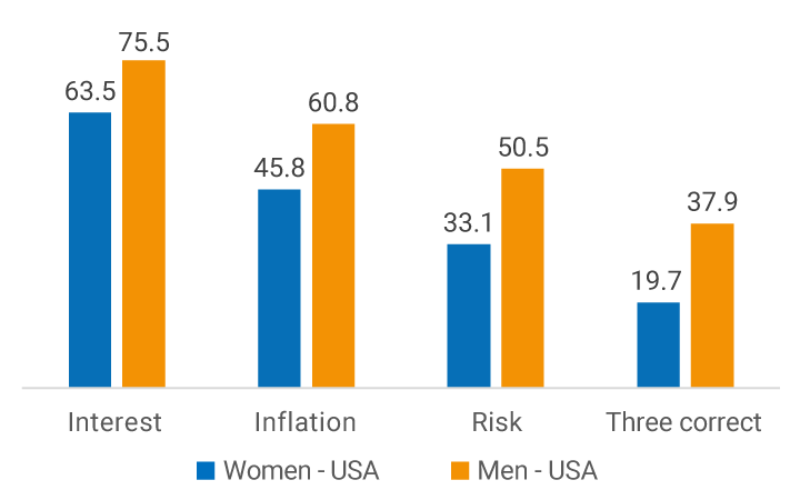 It is also possible to analyze the results by gender in each of the surveys. This information can be helpful in designing public policies and financial education programs that contribute to closing gender gaps that often significantly impact saving-for-old-age behavior. Graph 5A shows that the interest rate concept in Colombia is more familiar to men than to women, while in the other two questions (inflation and risk diversification), women are more knowledgeable than men. In turn, in the United States (Graph 5B), the percentage of men who answered each and every question correctly is higher than that of women.