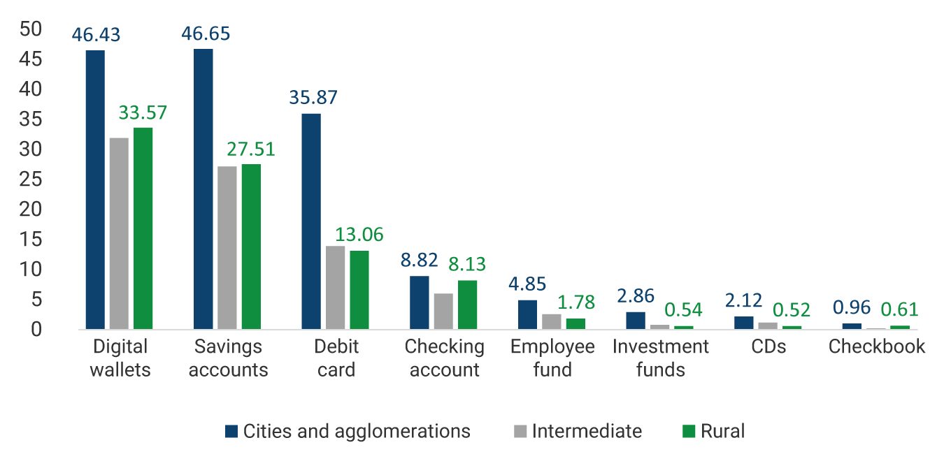 The first panel of Figure 2 shows that the holding of digital wallets has become as widespread as that of traditional savings accounts and is higher than that of debit cards. It highlights that the ownership of financial products, including digital products, is considerably wider in large urban agglomerations than in intermediate municipalities2 and rural areas. However, the bottom panel shows that digital wallets are more widespread among lower-income households than savings accounts, suggesting the great potential of emerging digital instruments to advance financial inclusion.