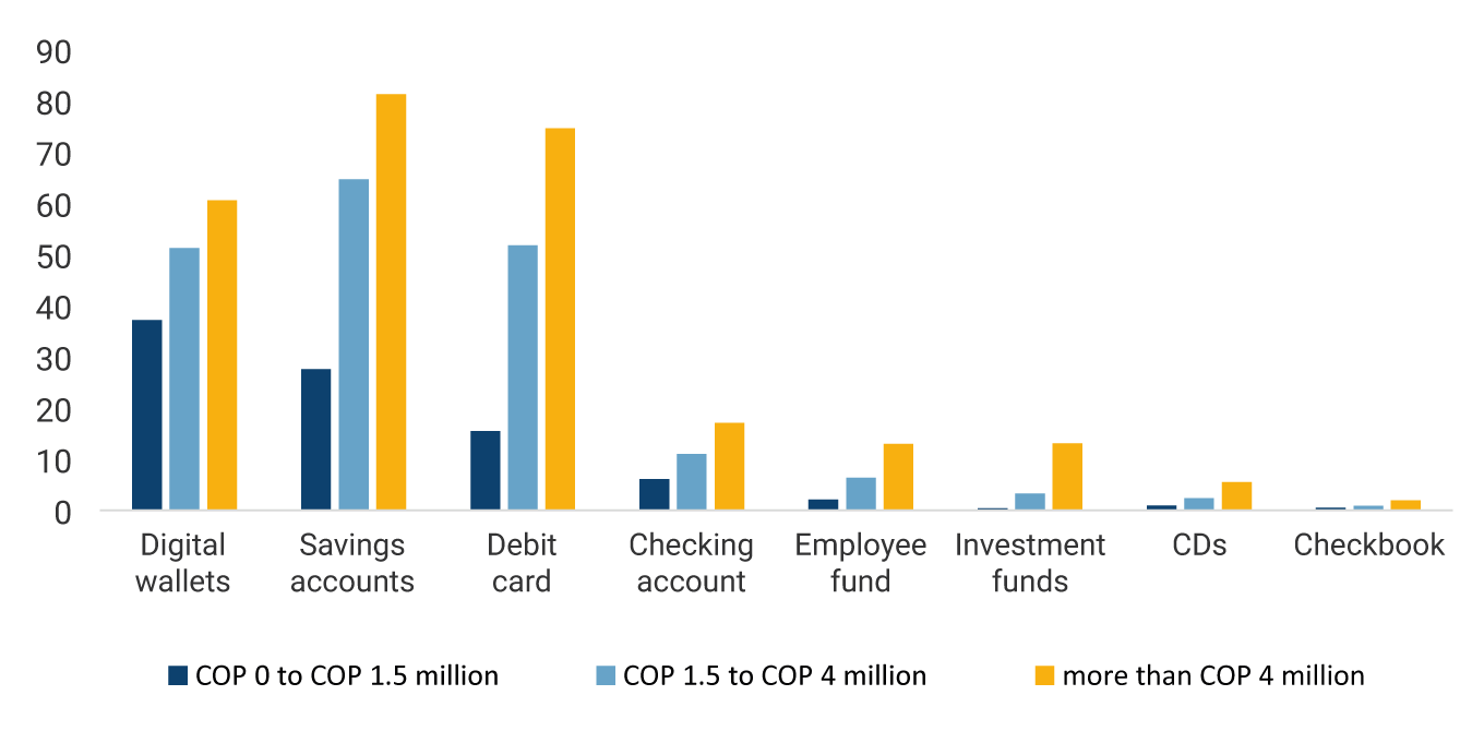 Similarly, Colombians prefer to keep their savings in cash. About 40.0% of those who choose to save do so by keeping their money at home, 20.8% in banks, cooperatives, or employee funds, and 17.7% in e-wallets . Individuals in high-income households prefer to save in the financial system, while low-income households prefer to save at home.