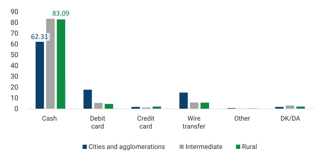 The increased digitalization of the economy can also be seen in how individuals receive their main income. While slightly more than half of adults receive it through wire transfers, 35.0% receive it in cash, and 12.0% through drafts , checks, or other options. Wire transfers are prevalent in cities and among high-income households , while cash is prevalent in rural areas and among low-income households.