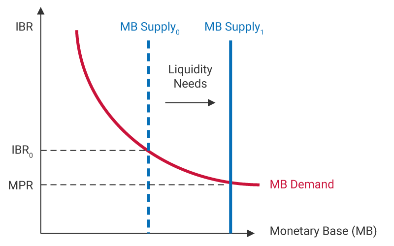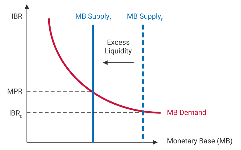 The operation of the primary liquidity market is illustrated in Graph 1. Panels A and B show two alternative scenarios. In Panel A, the vertical axis represents the Reference Banking Indicator (IBR in Spanish), which measures the price (interest rate) assigned by the market to primary liquidity2. The horizontal axis measures the amount of the monetary base. The monetary base supply that the Central Bank has put into circulation (BM0 supply) is illustrated by the dashed blue vertical line. Its demand is represented by the red curve, which shows that the higher the interest rate, the lower the non-interest-bearing deposit balances that banks want to keep at the Central Bank. Panel A presents a situation where the market equilibrium occurs at an interest rate, IBR0, higher than the MPR. If this situation persists, i.e., if the economy's short-term interest rate is higher than the rate considered compatible with achieving the inflation target, monetary policy would in practice be more restrictive than desired. This is because the supply of the monetary base is insufficient to balance the market at a rate close to the MPR. Banco de la República is therefore required to carry out operations that expand the monetary base to the solid blue vertical line. Panel B illustrates the opposite case, where the economy has excess liquidity, leading to a lower market interest rate (IBR0) than the MPR announced by the Central Bank and resulting in a looser monetary policy stance, thus requiring the Bank to collect such excesses.