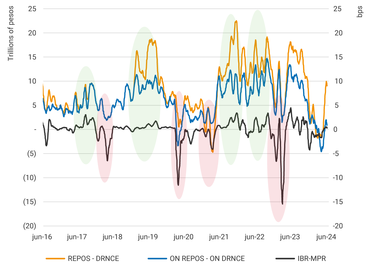 Banco de la República chooses to use the available instruments to maintain a situation in which certain levels of liquidity needs are present in the market. Under such conditions, the IBR usually remains close to the MPR, as represented by the black line around the zero axis in the graph. However, if these liquidity needs exceed a certain level, upward pressures on the IBR are often evident (green ovals). Conversely, when there are low liquidity needs, or even excess liquidity, the IBR has shown more significant and persistent negative deviations from the MPR (pink ovals).