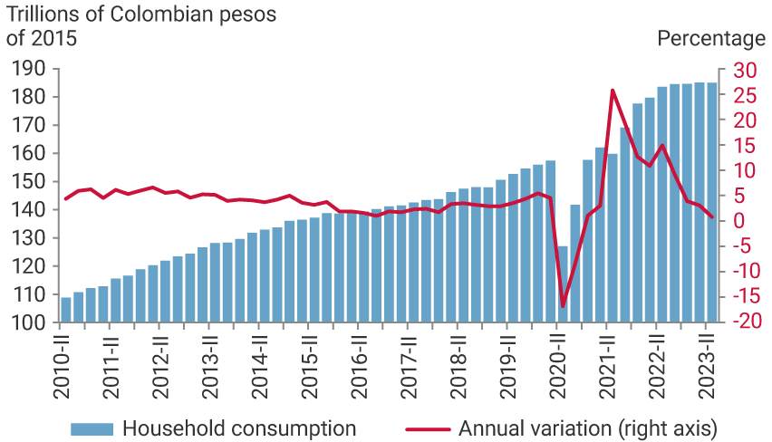 To complete the analysis, it is important to begin by defining the main objective of monetary policy, which is to maintain the currency's purchasing power while trying to achieve the highest possible sustainable growth and mitigate the volatility of economic cycles. In this regard, it is important to emphasize that growth beyond what is sustainable can lead to overheating of the economy, which in turn leads to a greater risk of future crises and a reduction of production in the long term. What happened in Colombia after the pandemic, especially in 2022, fits this pattern, since production exceeded its natural output level (according to estimates by the technical staff at the Central Bank), thus generating an imbalance between aggregate supply and demand that resulted in a historically high output gap. This was mainly due to the high level of household consumption, as can be seen in Graph 1, which exhibits the dynamics of household expenditure in the left panel and the balance and growth of the consumer portfolio in the right panel.