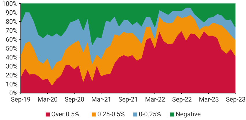 However, when there are multiple supply shocks that accumulate and persist over time, generalized price increases occur and the changes in relative prices originated in the supply shocks tend to dilute. This situation illustrates what has happened in Colombia over the past four years. The country has experienced shocks that have impacted production costs through various channels: a pandemic, the effects of expansive external fiscal policies, disruptions in supply chains, road blockades and disruptions, adverse weather events such as La Niña and El Niño, and the loss of the investment grade by two credit rating agencies, among others. This situation, unprecedented in the country's recent economic history, has not only increased the prices of some specific goods, but has also affected the entire basket of goods included in the consumer price index, as shown in Graph 1. Even if the origin of current inflation were solely due to these supply shocks (which is not the case), their broad effect on the economy merits consideration and action by monetary policy authorities.