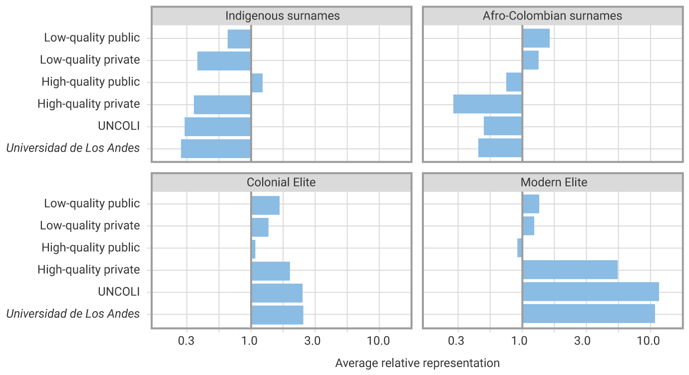 Using information from the Sistema Integrado de Matrículas (SIMAT in Spanish) and the Colombian Institute for the Promotion of Higher Education (ICFES in Spanish), a relative representation indicator was defined as the ratio between the participation of a surname in an institution over its share in the total population of students registered in SIMAT. When the indicator is higher than one (or less than one), the surnames under consideration are overrepresented (or underrepresented) in the institution concerned. Institutions are grouped according to their quality level and their public or private nature. High- and low-quality institutions are those in the top and bottom 5.0%, respectively, on the national standardized test. Additionally, schools belonging to the Unión de Colegios Internacionales de Bogotá (UNCOLI in Spanish) and Universidad de los Andes, which are good quality institutions that traditionally serve Colombia’s elites, are examined.