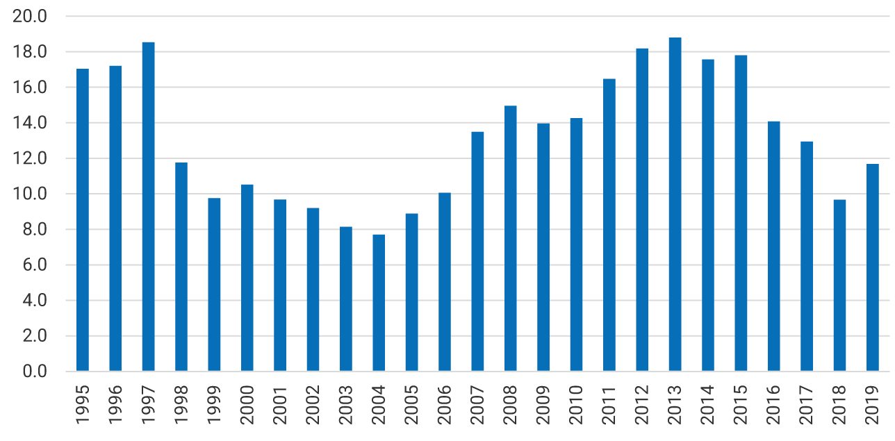 The first evidence of this phenomenon emerges when observing the evolution of the different CNG expenditure items during the last twenty-five years, as presented in Graph 1. This shows a relative investment stagnation in GCF, which contrasts with the growing trend in transfers and pensions. Indeed, CNG investment remained around 2.0% of Gross Domestic Product (GDP) between 1995 and 2019, while transfers increased from 4.6% to 8.0% of GDP, and pension spending rose from 1.1% to 3.5% of GDP. The relative stagnation of government investment is confirmed when observing its share in primary expenditure (total expenditure excluding interest), which registers substantial cycles but without a clear trend during the period analyzed (Graph 2). The lack of dynamism in government investment is part of the so-called bias against capital expenditure. This phenomenon, characteristic of many developing economies, prevents investment from acquiring greater importance within primary expenditure.