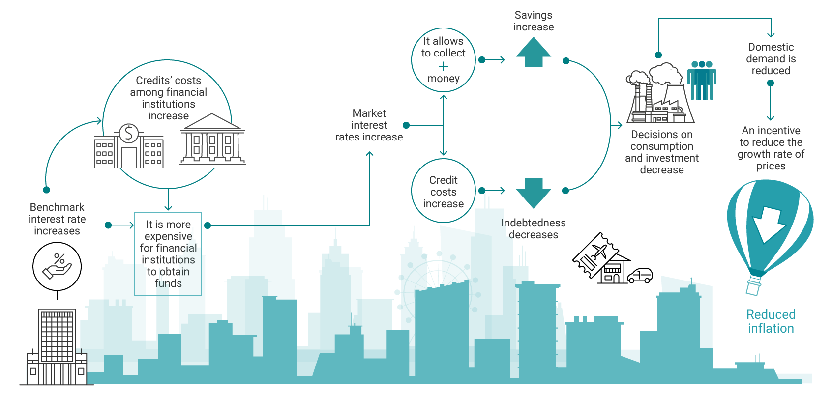 To understand the different channels, from now on, we are going to suppose that the decision made by the Board of Directors is an increase in the benchmark interest rate as a consequence of an inflation forecast that exceeds the long-term goal (3.0%) for reasons other than transitory supply factors.