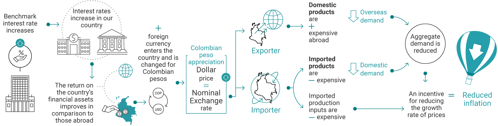 Following our example, it is clear that, when the Board of Directors increases its benchmark interest rate, it leads to an increase in market interest rates. This could in turn contribute to an improvement in the relative return on financial assets of the country, compared to those abroad. Therefore, this would make it more appealing to invest in Colombia, which means foreign currency (dollars) would enter the country and would then be exchanged for Colombian pesos. As the number (supply) of dollars available in the Colombian foreign exchange market increases, the dollar price tends to decrease, resulting in an appreciation of the Colombian peso (a decrease in the nominal exchange rate). In this new situation, there are different effects, depending on the sector being analyzed: exporter or importer.