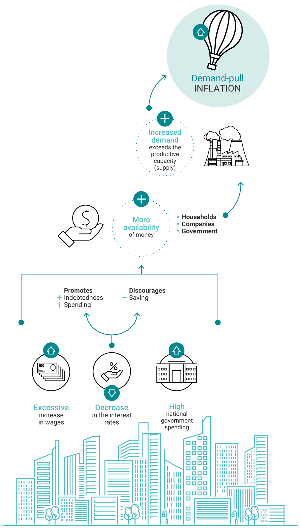 Something similar happens in an economy when there is more money available than before. It is either due to an excessive increase in the salaries, or a decrease in the interest rates1 offered by the financial system, which encourages us to take on more debt to spend money (or save less), or a high national government expenditure, among other reasons. As happened in the second round of the auction, with more money available from families, companies, or the government itself, the country’s aggregate demand will surely increase, and if it exceeds the economy's productive capacity (that is, supply), the prices paid by consumers would be pushed up, resulting in demand-pull inflation.