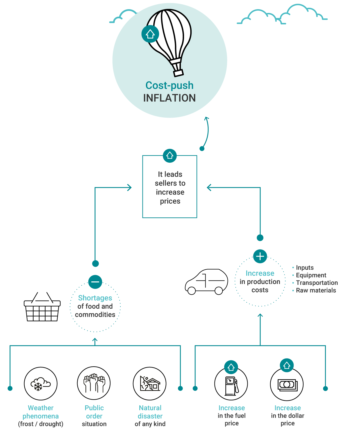 Let’s suppose a scenario where a certain number of buyers regularly go to a marketplace, but due to some climate phenomenon (such as drought or frost) food is scarce, with not enough products for everyone. This encourages sellers to increase prices to benefit the most from this food shortage. Similar cases occur when product shortages are caused by public order situations or natural disasters that affect the country’s mobility, and insufficient stockpiling of products for the points of sale, pushing up prices due to a temporary reduction in supply, without changes in demand.