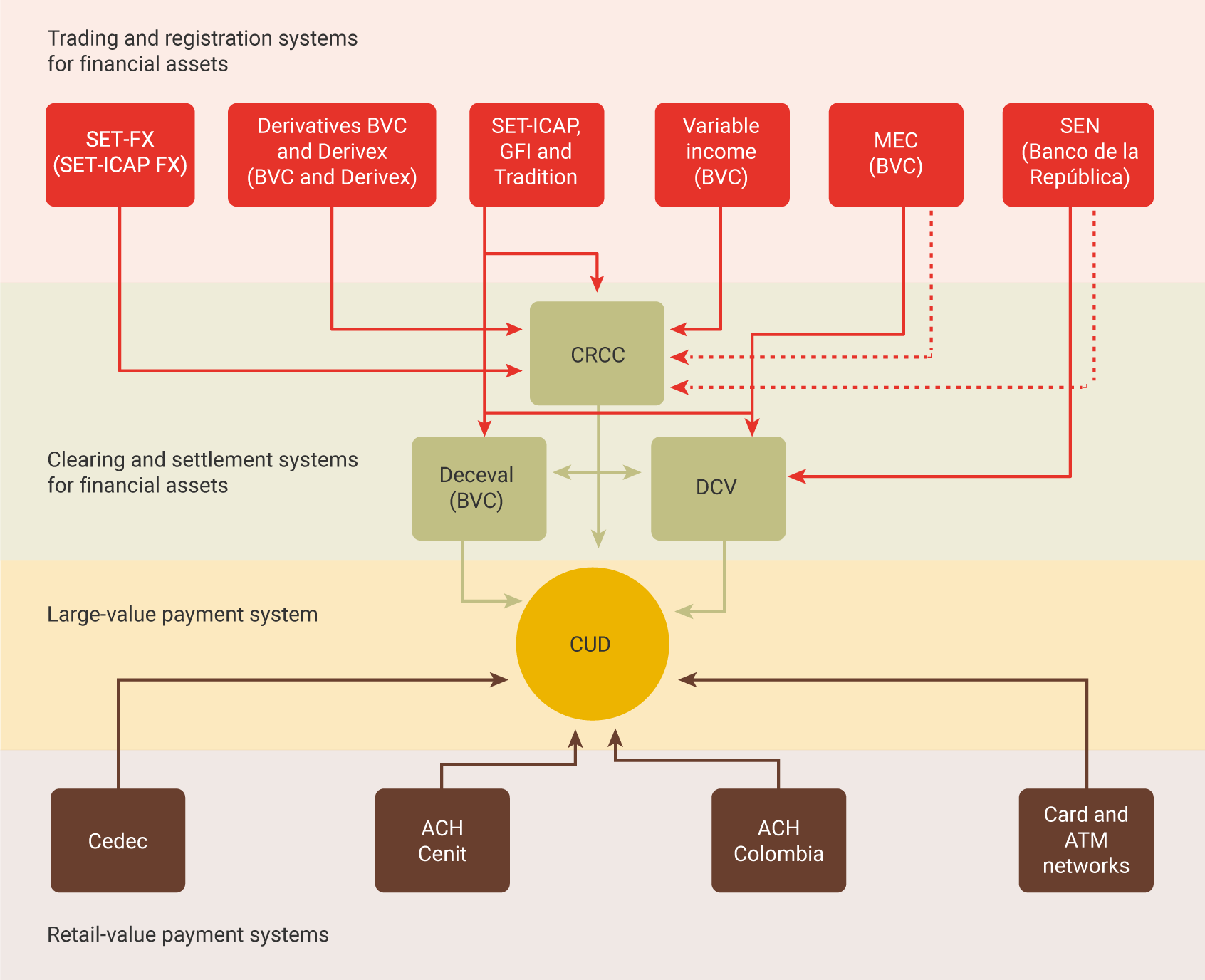 It also monitors the retail-value payment systems interconnected to the CUD, which are responsible for the settlement of electronic payments made between individuals and companies in the circuit of goods and services. These are: ACH Cenit, ACH Colombia, Cedec, and several ATM and credit and debit card networks.