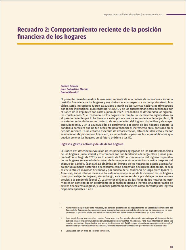 This box analyzes the recent changes in a battery of indicators on the financial position of households and their trends with respect to their historical behavior. These indicators were calculated based on the quarterly national accounts by institutional sector published by DANE and the financial accounts published by Banco de la República with a cut-off as of June 2022. The following conclusions can be drawn from the analysis: 1) household consumption has risen significantly in the recent past, and this has placed it above its longterm trend, 2) the above has occurred in a context of recovering in the disposable income and higher indebtedness, and 3) the accumulation of equity by households during the pandemic appears to have not been sufficient to finance the increase in their consumption in the recent period. In an environment in which a slowdown, high indebtedness, and lower accumulation of financial equity are expected, it is important to monitor the vulnerabilities that households may generate for CIs in the near future.