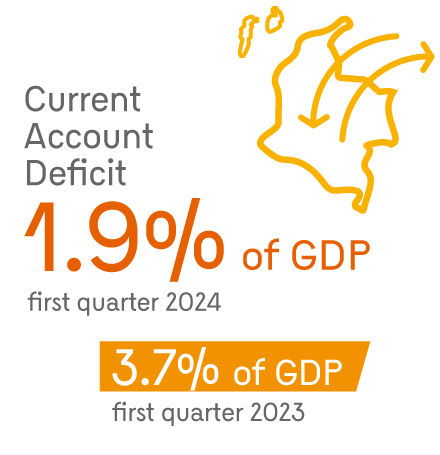 • By 2024, the technical staff projects a current account deficit close to 2.8% of GDP, moderately higher than the 2.5% deficit observed in 2023 and significantly lower than the 6.1% deficit of GDP recorded in 2022. The smaller current account deficit makes the Colombian economy less vulnerable to negative external shocks.