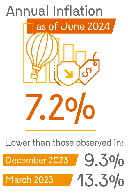 In the first quarter of 2024, the figures of the National Administrative Department of Statistics (DANE in Spanish) showed that the economy achieved annual growth of 0.9%. Although this result was moderate, it confirmed the economy's recovery path. Monetary policy has played a critical role in containing inflationary pressures. This has allowed inflation to trend downwards, continuing into the first half of 2024. Net foreign reserves totaled USD 60,901 million as of 30 June 2024, a slight increase over the course of the year. For 2024, the profit of Banco de la República (the Central Bank of Colombia) is projected at COP 8,795 billion.