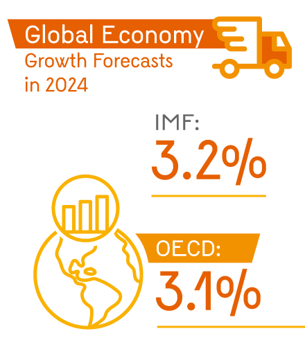 • The global economy would continue to grow in 2024 at a rate slightly higher than 3.0%, according to forecasts from the International Monetary Fund (3.2%) and the Organization for Economic Cooperation and Development (3.1%).