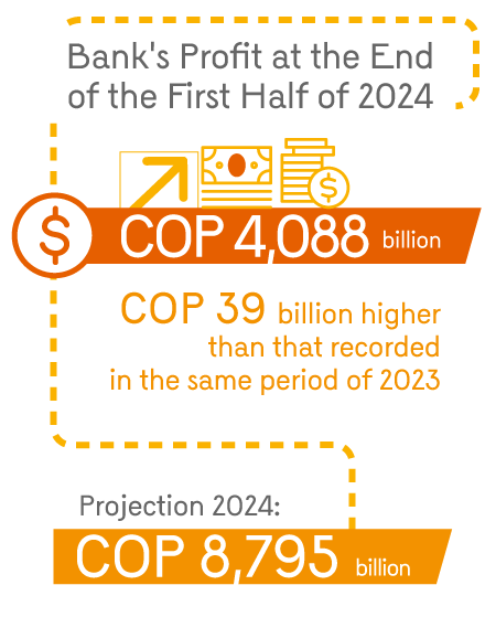 • Banco de la República's profit at the end of the first half of 2024 amounted to COP 4,088 billion (b), as a result of revenues of COP 5,903 b and expenses of COP 1,815 b. This profit was COP 39 b higher than that recorded in the same period of 2023.