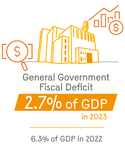 • The 2024 Medium-Term Fiscal Framework (MTFF-24), presented by the Ministry of Finance in mid-June, shows that the General Government produced a 2.7% deficit of GDP in 2023, which means a reduction of 3.6 pp vis-a-vis 2022.