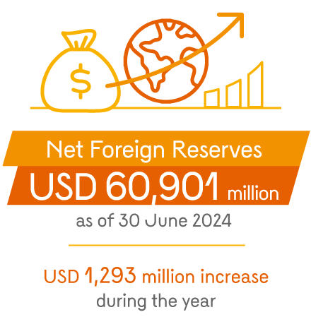 • Net foreign reserves totaled USD 60,901 m as of 30 June 2024, an increase of USD 1,293 m over the course of the year. This increase is primarily due to the program to accumulate international reserves announced by the BDBR in December 2023.