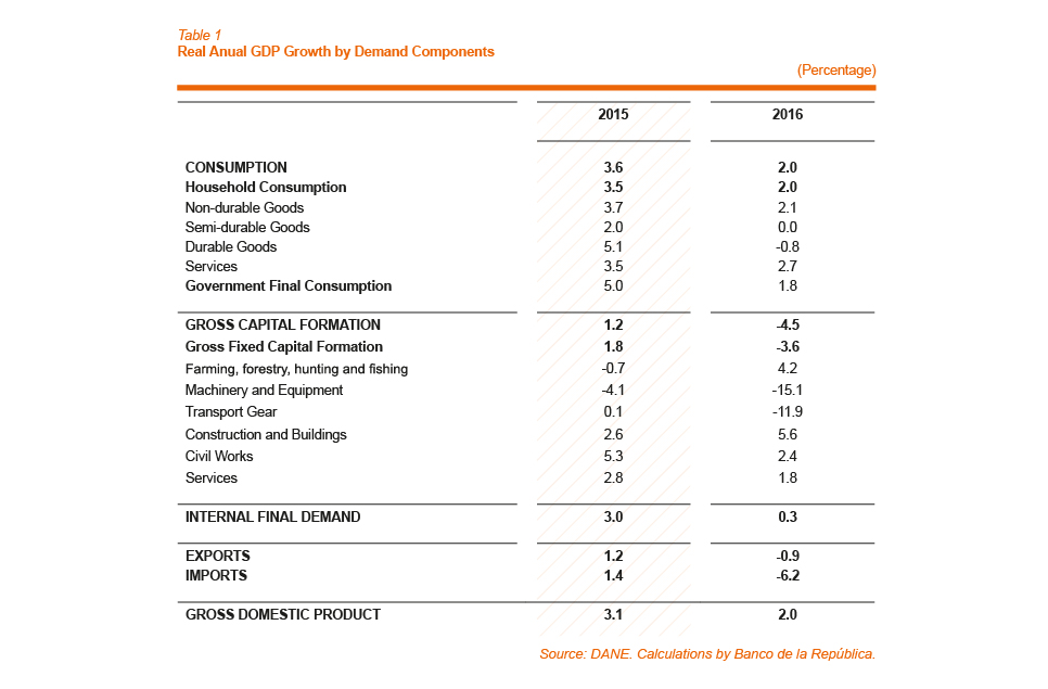 | Oil revenues accounted for about 20% of the National Government's total income in 2013 (3.3% of GDP), 6.9% (1.1% of GDP) in 2015, and virtually disappeared in 20167. Partly for this reason, the fiscal deficit moved from 2.4% of GDP in 2014 to 4.0% in 2016, in spite of the adjustment in current expenditure and investment, and of the increase of certain taxes8 proposed by the Government and processed by the Congress. The larger deficit and the high interest payments generated by the depreciation increased the Central Government's debt from 35% of GDP in 2013 to 44% in 2016. The external and fiscal adjustments, as well as the loss of dynamism of national income, resulted in a deterioration of domestic demand, which along with a weak external demand led to a slowdown in growth that went from 4.4% in 2014 to 2.0% in 2016. Particularly, lower household income, adjustment of public expenditure, higher financing costs, real depreciation, and the fall in consumer confidence explain the weakening of domestic consumption. Similarly, investment was affected by the reduction in oil and mining projects, by the adjustment of public investment, and by lower imports of capital goods due to the depreciation of the peso. |