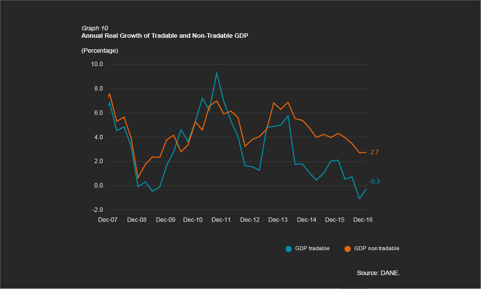 | On the side of external demand, in 2016, exports fell 0.9% in real terms, as a result of the lower oil production and the weak demand by the country's trading partners. In the year, crude oil production was of 885.7 thousand barrels per day, falling 11.1%. This was offset by the 6.2% contraction in imports in real terms, which allowed for a positive contribution of the trade balance to GDP growth. Analyzing the behavior of the different sectors (except for the good performance of financial services, construction, and industry, which grew 5.0%, 4.1%, and 3.0%, respectively), other branches of activity exhibited a general slowdown, which recorded a lower expansion in 2016 than the average for the last ten years (Table 2). Production of tradable sectors showed stagnation vis-à-vis the 1.4% growth in the previous year, mainly as a result of lesser mining activity. On the other hand, non-tradable activities slowed down from 4.1% in 2015 to 3.2% in 2016 (Graph 10). |