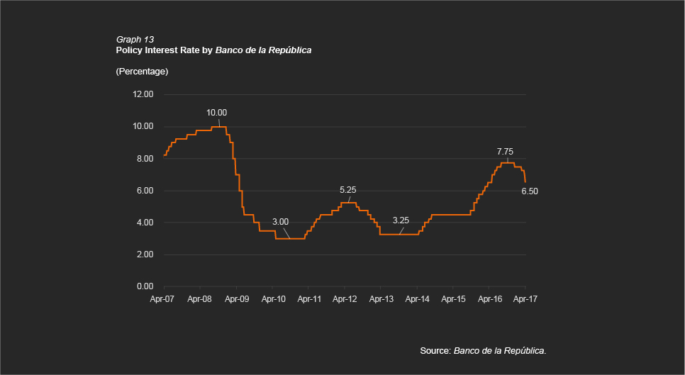 | During 2016, net capital inflows reached USD 12,764 million, i.e., USD 5,529 less than observed the previous year. These revenues are explained largely by the USD 13,593 million from foreign direct investment (56% of the total external revenue), and to a lesser extent by portfolio investment in the local market (24% of the total). These inflows of foreign capital to the country show that, despite the macro-economic adjustment, Colombia continues to exhibit an imbalance between savings and investment. This makes it necessary to resort to external savings in order to finance the expenditure needs of the economy. D. Monetary Policy, Interest Rates, and Credit Between September 2015 and mid 2016, the Central Bank increased the benchmark interest rate by 325 basis points in order to control inflation and prevent inflation expectations from deanchoring10. These increases were transmitted more intensely to commercial credit rates, and to a lower extent, to those of household credit. As the inflationary outlook began to recede, and considering the risk balance between expected growth and inflation expectations, the Board of Directors started to lower the policy rate, and decided to lower it by 25 bp in each of its meetings in December 2016 and February and March 2017, and 50 bp in its last meeting, placing it at its current 6.5% level (Graph 13). As convergence of inflation to the target set by the Central Bank continues, inasmuch as the economic data allows for it, the Board will define the pace for the reduction of the benchmark interest rate. |