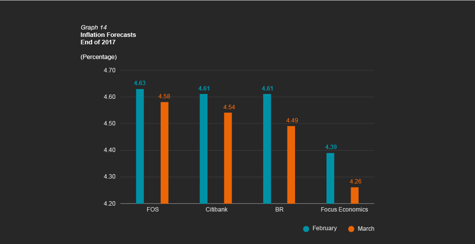 To March 2017, the declining trend in inflation has continued, mainly explained by the lower increases in food prices (5.97% in January, 5.21% in February, and 3.65% in March). In particular, the falls observed these months in the prices of perishable foods (close to 10%) are a clear signal that the effects of the previous climate shock are disappearing. On the other hand, although the accumulated depreciation of the exchange rate has also ceased to have any impact, the annual variation in prices for tradable goods, which had decreased considerably by the end of last year, has shown slight increases so far this year. This might be related to the impact of the tax reform and to the entry into force of the Liquor Act. Once more, these are transitory shocks whose effects may possibly disappear at the beginning of 2018. |