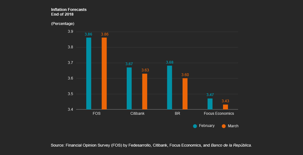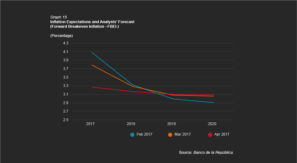 | In 2017, the Colombian economy is expected to continue adjusting to the lower levels in the terms of trade in such a way that the fiscal, external, and relative price adjustments, together with policy measures, allow for macroeconomic imbalances to disappear during the year. This adjustment could be alleviated by: better expected external and domestic conditions, given the improvement in developed and emerging economies; the relative recovery of the prices of commodities, mainly oil; the better performance of some of the country’s trading partners; and the fading effects of El Niño and accumulated depreciation of the peso on inflation. For this year, the Central Bank’s technical staff forecasts a growth figure slightly below to that observed in 2016 (1.8%). This estimate differs slightly from the figures by the Government and other analysts, such as Fedesarrollo and Anif, who expect a higher growth rate, close to 2.5%. Among the factors that could cause the economy to grow less is the uncertainty regarding the policies of the new government of the United States, the normalization of monetary policy in that country (which would be reflected in an increase in interest rates), and the unclear scenario of our major trading partners in the region, particularly Ecuador and Venezuela. Locally, the pace of recovery of the main economic activities as a response to external and internal factors is uncertain. However, should expenditure on fourth-generation infrastructure projects (4G) and government housing programs consolidate, public investment could be one of the sources driving growth this year. Additionally, tax benefits to the companies included in the reform could have effects on private investment, but this effect would be more likely to be seen in the medium and long terms. Finally —and this could be a determining factor— Banco de la República began lowering its benchmark intervention rate a few months ago, and will continue to do so as long as inflationary pressures recede. Consumer inflation is expected to continue converging toward the Central Bank's 3.0% target during 2017 and 2018, once the effects of the transitory supply shocks fade, inflation expectations become anchored once more, and the indexation of some prices reduces. Inflation expectations for 2017 and 2018 reported by financial analysts corrected the upward trend displayed throughout 2016, approaching the upper limit of the target range (2.0%-4.0%). (Graph 14). The different surveys report average expectations ranging between 4.26% and 4.58% to December 2017, and between 3.43% and 3.86% to December 2018. |