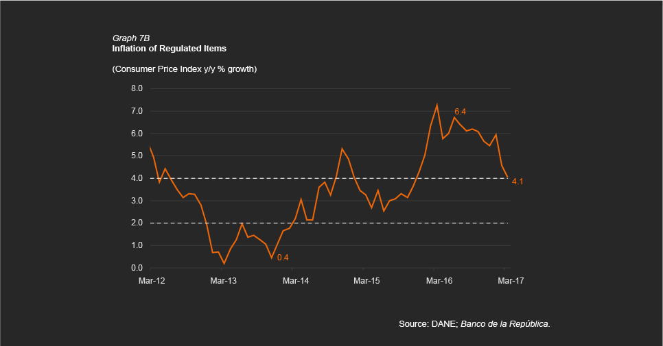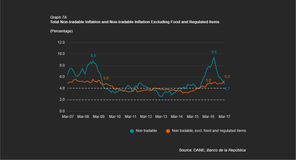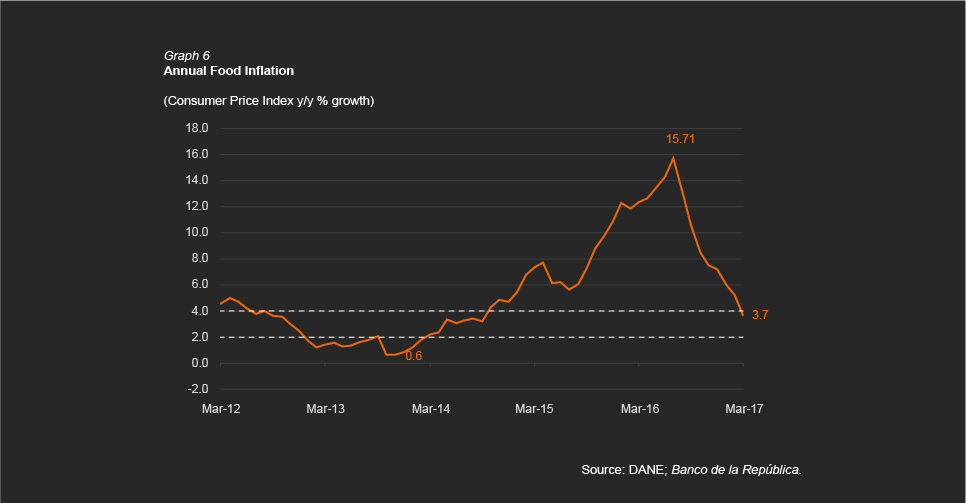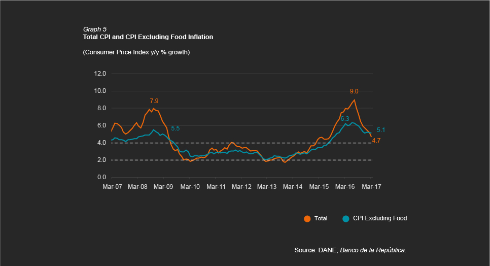 | Amidst this context, the adjustment process continued during 2016 in a relatively orderly manner and according to the forecasts. The macroeconomic imbalances, which reflected on the devaluation of the peso, deterioration of national income, weakening of economic activity, and the increase in inflation continued throughout the year, but some of them began to show signs of improvement in the second half of the year. For 2017, the adjustment process is expected to continue, particularly in the non-tradable and tradable sectors different from oil. Once this process is completed, the economy is expected to return to its potential growth path, and inflation is expected to converge to the long-term target set by Banco de la República. A. Inflation Annual consumer inflation recorded a steady acceleration in the past two years, but began to decrease as of August 2016. Inflationary pressures (all of them transitory) generated by the accumulated depreciation, the El Niño phenomenon, and the trucking strike in mid 2016, strongly affected prices since the end of 2014 and led inflation to increase from 3.66% that year to 6.77% at the end of 2015, reaching a maximum level9 of 9.0% in July 2016. Since the second half of 2016, a marked downward trend of inflation began to be observed, attributable both to the dissolution of the impact of the transitory shocks mentioned before and to the effects of the Central Bank's contractionary monetary policy (which started in September 2015 and extended along 2016). Thus, total annual inflation in December 2016 stood at 5.75%, and had fallen to 4.7% in March 2017. Non-food inflation, on the other hand, reached levels close to 6.3% on a yearly basis by mid 2016 and ended the year at levels close to those of headline inflation (5.14%). In March of this year, it was 5.13% (Graph 5). |