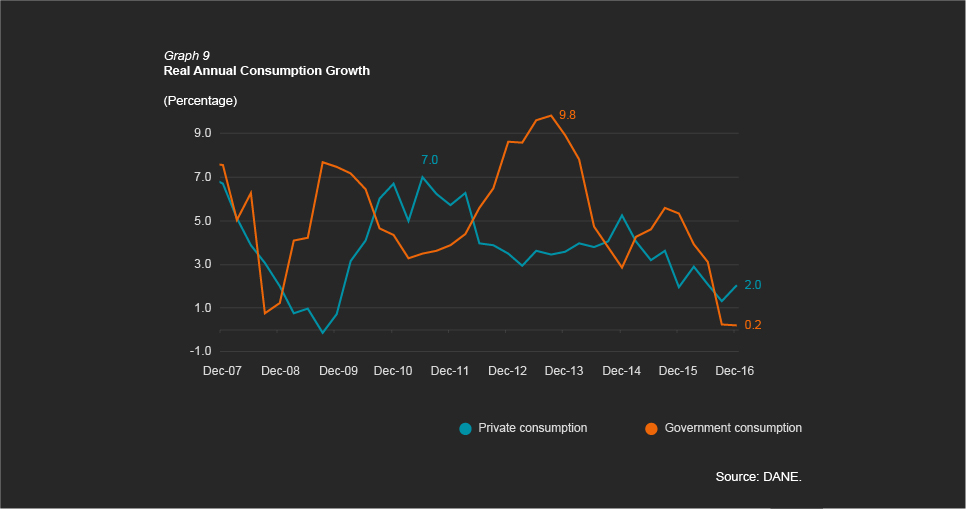 | Investment grew 11.6% in 2014 and 1.2% in 2015, but contracted 4.5% in 2016. Among the main items that exhibited deterioration are investment in machinery and equipment and in transport equipment, partly due to the lower profitability of the oil and mining sectors, the accumulated depreciation, and higher financing costs. The decline of these investments was slightly offset by increased investment in construction, stimulated by several National Government programs intended to encourage social housing construction and by increased spending on infrastructure by local and regional governments. The rate of growth of consumption fell to 2.0% in 2016 from 4.4% in 2014, due to moderation in both household and government spending (Graph 9). The lower growth in private consumption (2.0%) resulted from the loss in the purchasing power of real income. The depreciation of the peso, on the other hand, discouraged the purchase of imported products. The low growth in public consumption (1.8%) was mainly due to the adjustment of Government expenditure as a response to the fall in oil revenues. |