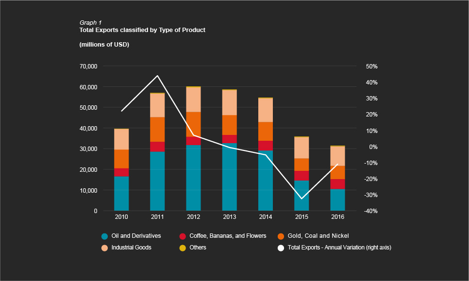 Natural resources, gold, and ferronickel play a central role in Colombian exports; therefore, it is still essential to take advantage of the country's mining potential, and to exploit strategic resources that can be inserted in the global value chains of goods with high technological content. In the first half of 2017, external sales of oil and its derivatives increased at an annual rate of 24.2% (Graph 1), due to the recovery of their international prices (Graph 2), as a response to a rebalancing of the global oil market that managed to offset the reduction in the quantities released. Additionally, the export value of coal increased 55% due to better international prices and greater quantities sold. As a result, during the first half of 2017, total exports exhibited a significant recovery, increasing at an annual rate of 20% (USD $2,963 m).