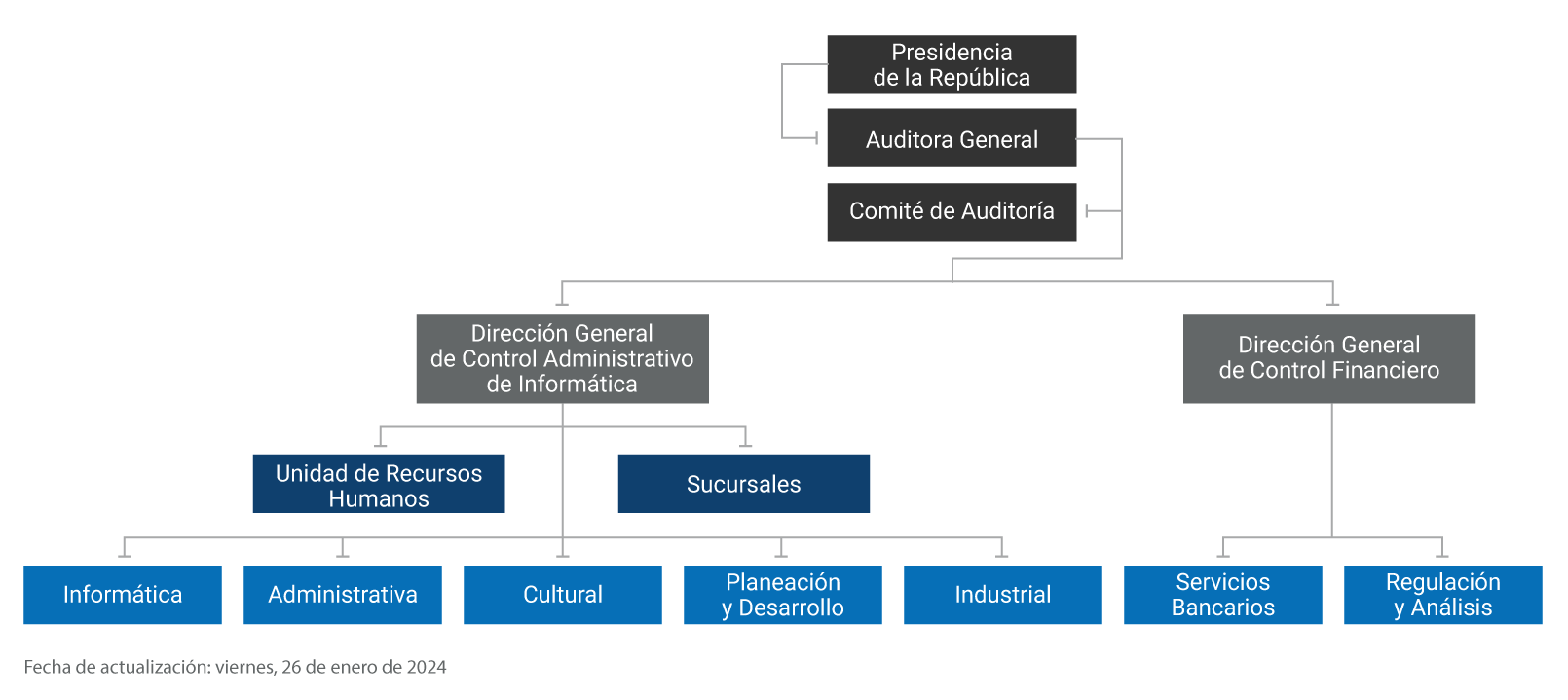 A continuación se presenta la estructura organizacional de la Auditoría General aprobada por la Junta Directiva, según acta 4031 del 16 de diciembre de 1994.