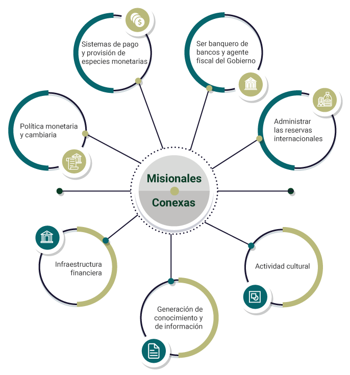 Las funciones y servicios se agruparon en dos categorías: misionales y conexas. Ambas se enmarcan en las autorizaciones y mandatos otorgados por la Ley 31 de 1992. Las funciones misionales corresponden a las actividades esenciales de banca central, en tanto que las conexas corresponden a aquellas que apoyan estas funciones o que están relacionadas con la gestión cultural (Gráfico 1).