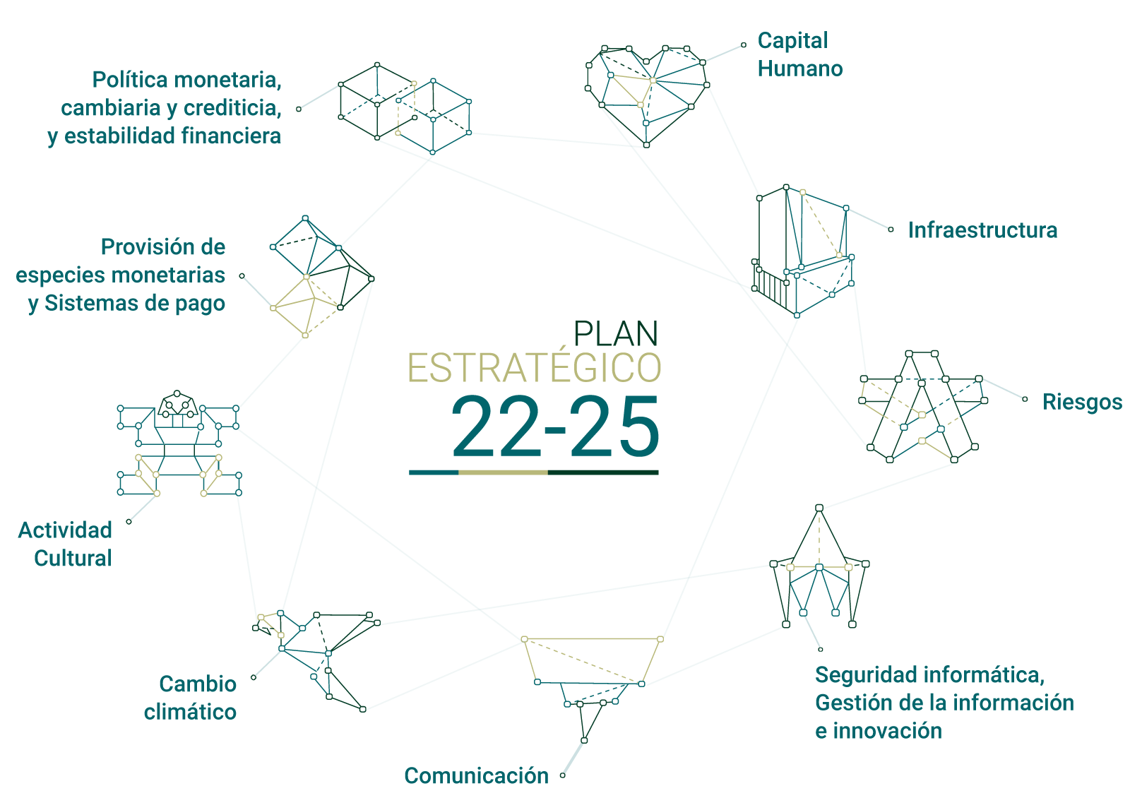Para la elaboración del Plan Estratégico 2022-2025 se analizaron las tendencias globales, el Plan Estratégico vigente, las particularidades del Banco, el impacto causado por la emergencia sanitaria por el Covid-19, los planes estratégicos de una muestra de bancos centrales referentes, así como su efecto en los temas de banca central, gestión corporativa y actividad cultural. Se realizaron varias sesiones de trabajo en las que participaron los codirectores del Banco, los gerentes general, técnico y ejecutivo y los subgerentes. Como resultado se definieron nueve temas estratégicos, cada uno de los cuales agrupa un conjunto de objetivos.