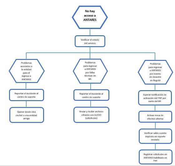 3.  No disponibilidad de Antares ante la declaratoria de un evento de desastre en Bogotá: Ante un evento de este tipo, el Banco de la República tiene previsto habilitar el sistema Antares desde su Tercer Nodo Tecnológico (TNT), para lo cual es necesario que siga el siguiente procedimiento:
