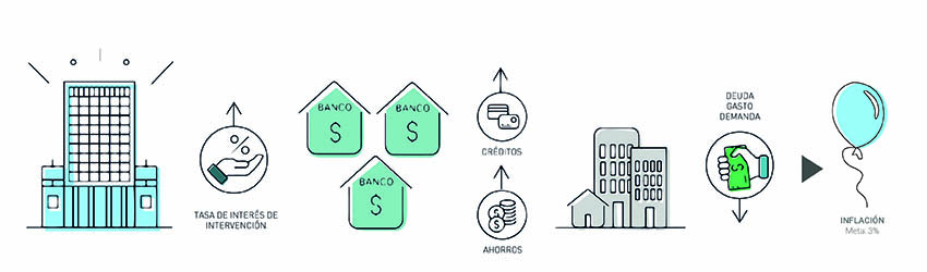 Las modificaciones del nivel de la tasa de interés de intervención tienen como fin influir en el crecimiento de corto plazo y la variación de los precios al consumidor. Esto sucede mediante distintos canales de transmisión, los cuales se pueden definir de manera sencilla como la cadena de acontecimientos que inician con un cambio de la tasa de interés del Banco y, con cierto rezago, afectan las tasas de interés del mercado a diferentes plazos, la tasa de cambio y las expectativas de inflación, variables que a su turno terminan influyendo en la variación del nivel de precios.