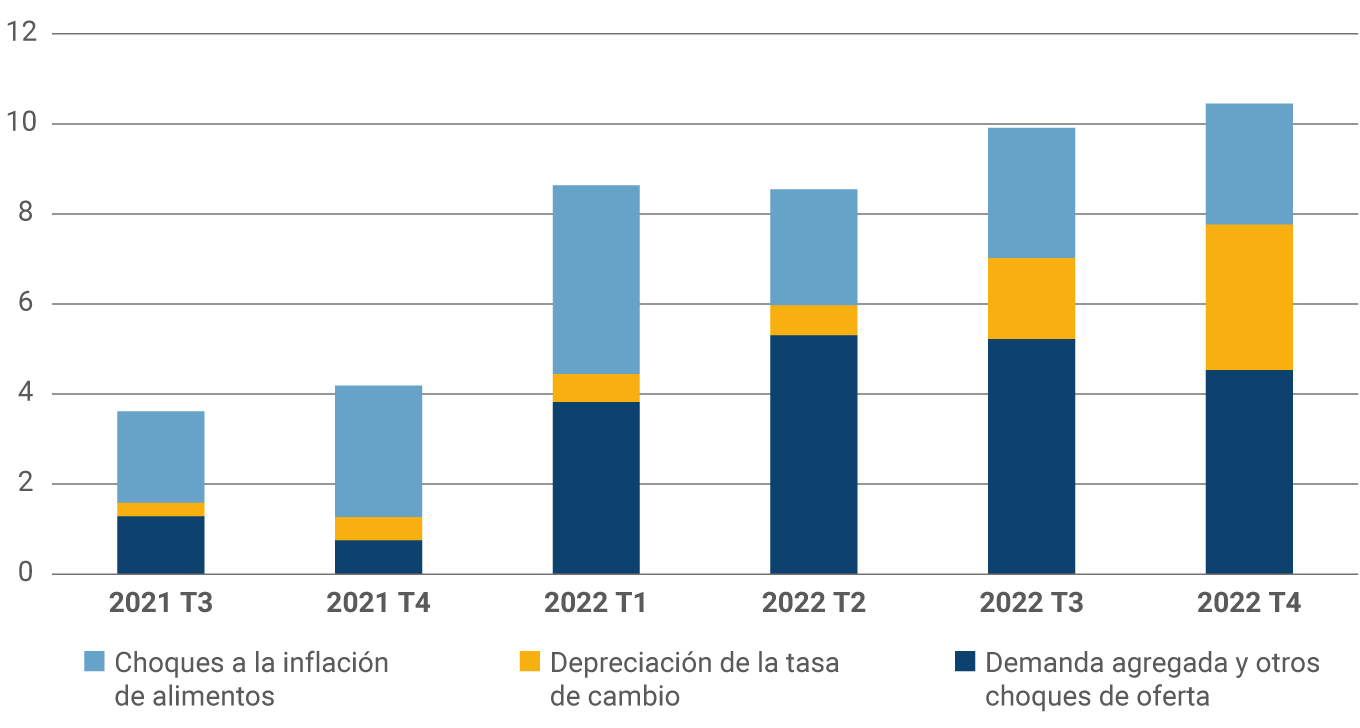 La anterior descripción de los determinantes de la inflación se confirma en el Gráfico 1, en el cual se presenta una descomposición de esa variable con ayuda del modelo 4GM, uno de los modelos centrales de pronóstico utilizado para el Informe de Política Monetaria. Se encuentra que en el segundo semestre de 2021 fueron los choques a los precios de los alimentos los que impulsaron la inflación, y que éstos perdieron relevancia en comparación con los demás choques de manera gradual durante 2022. Sin embargo, a finales de 2022 aún representaban alrededor del 25% de la inflación. En contraste, los choques que afectaron el tipo de cambio contribuyeron poco en 2021 y en la primera mitad de 2022, pero ganaron relevancia en el segundo semestre de 2022 hasta el punto de representar alrededor del 30% de la inflación a finales de dicho año. Por último, los demás choques de costos y los de demanda agregada, que no fueron un factor de evidente importancia a finales de 2021, ganaron relevancia durante 2022. Así, a finales de 2022, explicaban alrededor de 45 % de la inflación.