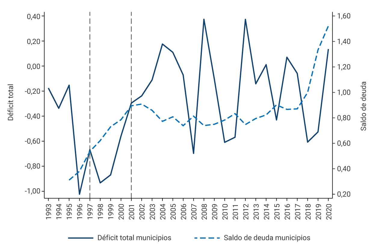 El gráfico muestra el aumento sostenido de la deuda para los dos tipos de entidad territorial desde el inicio de la profundización de la descentralización fiscal. En el caso de los municipios pasa del 0,30 % del PIB en 1995 hasta 0,85 % en 2002 mientras que, para los departamentos, durante el mismo periodo el saldo de la deuda pasó del 0,15 % al 0,53 % del PIB. En el caso del déficit, se observa también un deterioro significativo durante el mismo periodo. Posteriormente, se detiene esta tendencia y empieza un periodo de reducción de la deuda y el déficit y, en general, de recuperación de la sostenibilidad fiscal de municipios y departamentos.