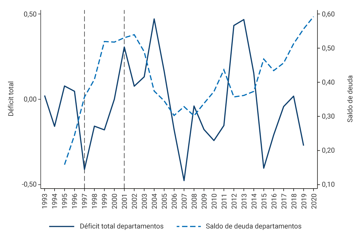 Para tener una idea de la situación fiscal territorial desde el inicio de su deterioro a mediados de la década del noventa, el Gráfico 1 muestra, para el periodo 1993-2020, el déficit total y el saldo de la deuda como porcentaje del PIB para los gobiernos municipales (Panel a) y para los gobiernos departamentales (Panel b). Las líneas verticales discontinuas señalan la entrada en vigencia de la Ley 358 de 1997 y la Ley 617 de 2000, que contienen las principales reglas fiscales subnacionales.