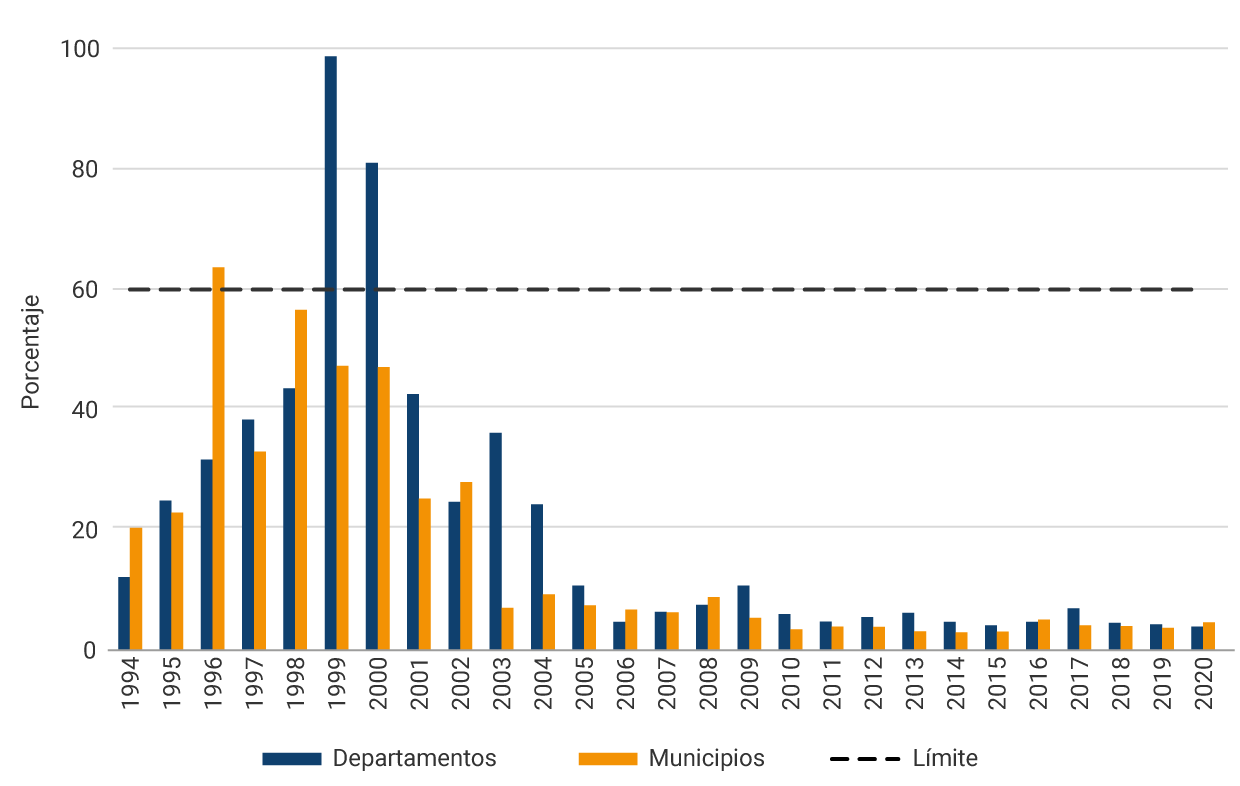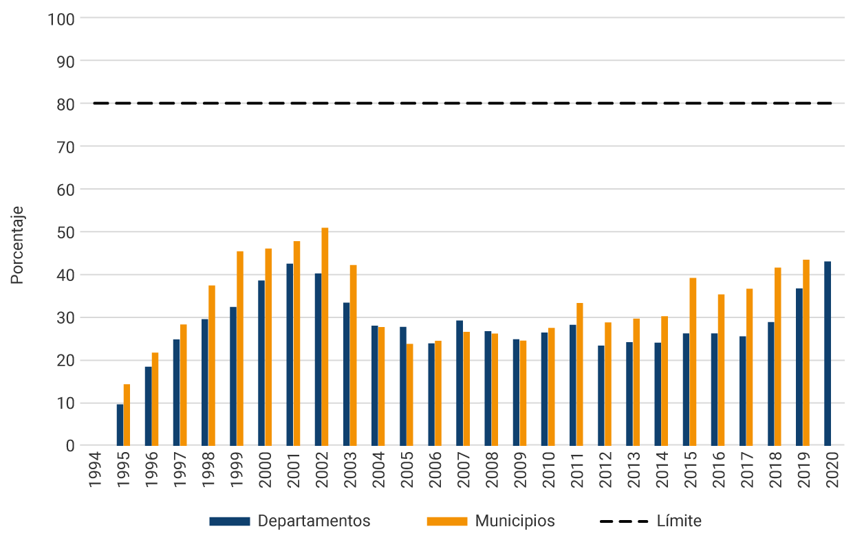 La reversión del deterioro fiscal subnacional está asociada con las reglas fiscales. Las primeras reglas, establecidas por la Ley 358 que se conoce también como “Ley de Semáforos”, tuvieron como propósito poner límites a la deuda de corto y largo plazo a través de indicadores de solvencia y de sostenibilidad. El indicador de solvencia se calcula como el cociente entre los intereses de deuda y el ahorro operacional y tiene un límite máximo de 60 %. El indicador de sostenibilidad se calcula como el cociente entre el saldo de la deuda y los ingresos corrientes e inició con un límite máximo de 80 %. Posteriormente, la Ley 617 de 2000 le puso límite al nivel del gasto de funcionamiento relativo a los ingresos corrientes de libre destinación. Esta regla incentiva a los gobiernos subnacionales a incrementar su recaudo propio, para poder incrementar sus gastos corrientes y mantenerse dentro del límite que establece la restricción.