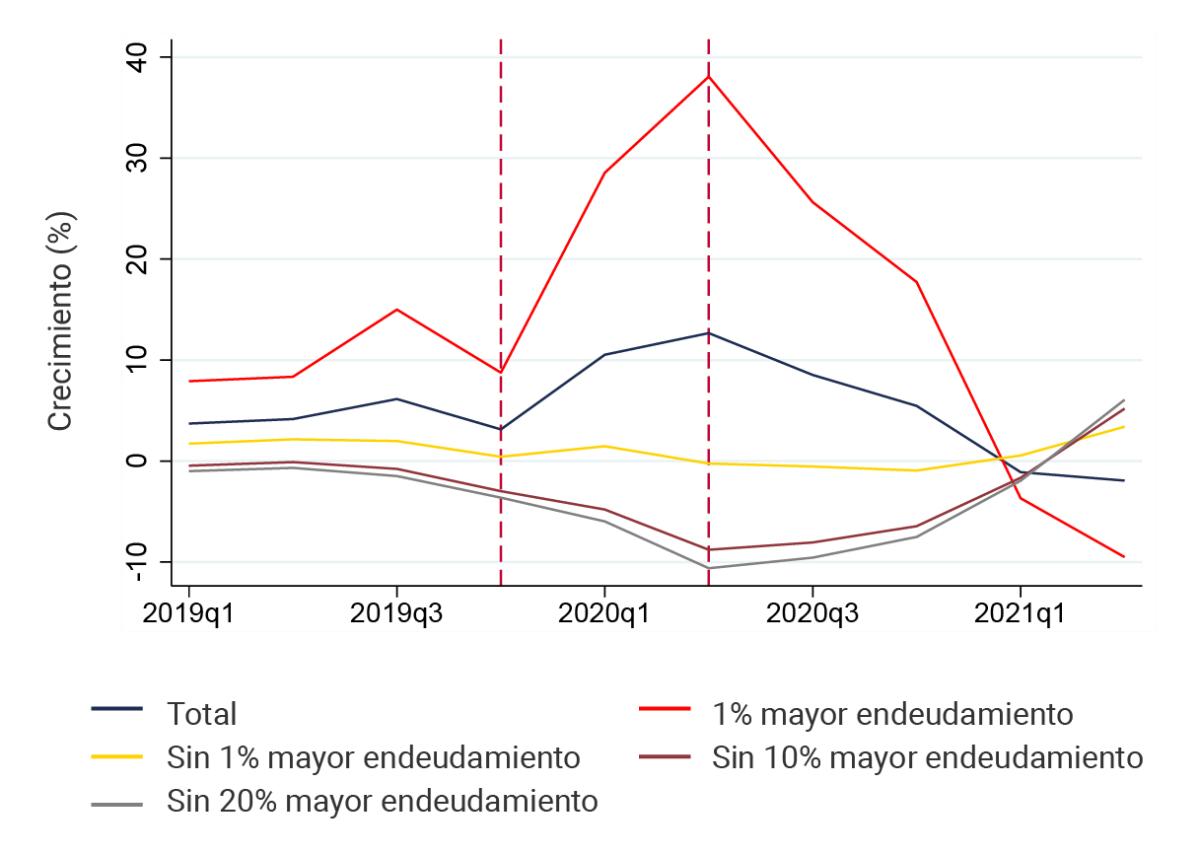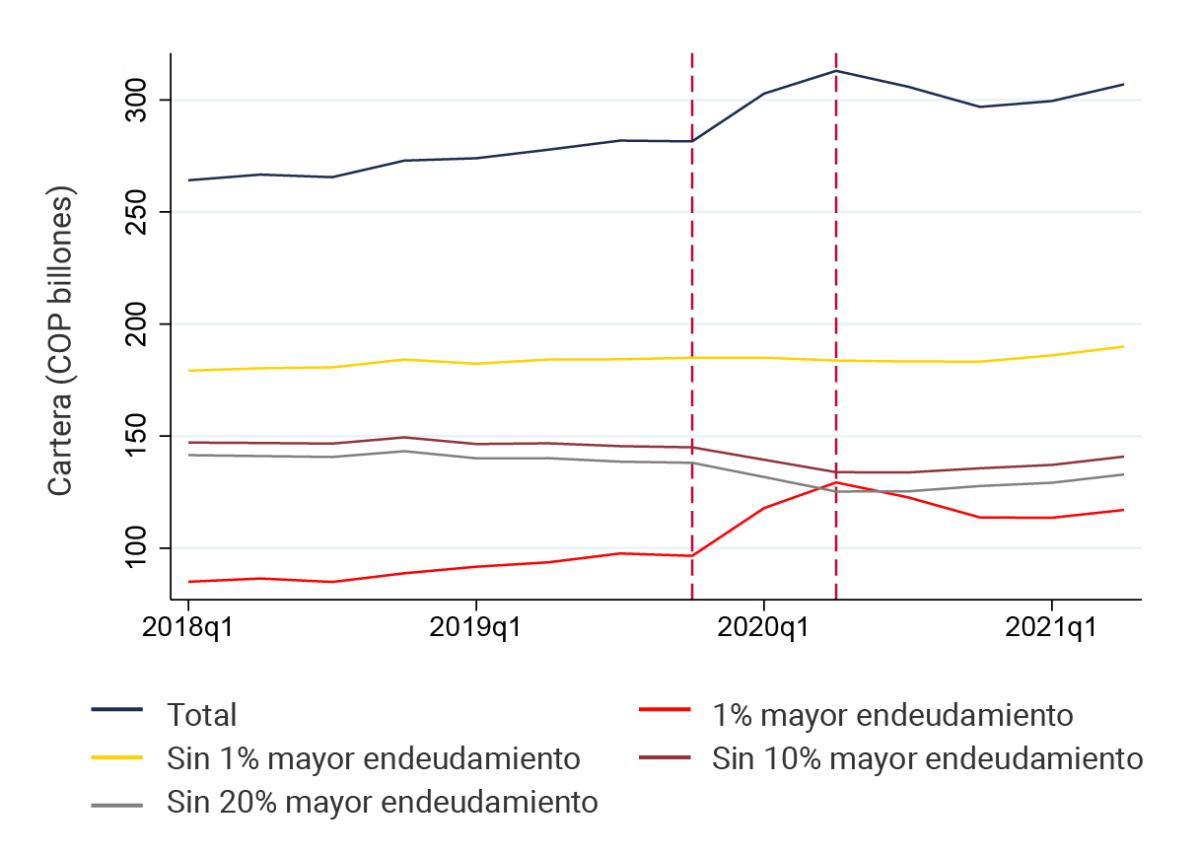 Un análisis de los datos revela que este comportamiento de la cartera comercial total pudo haber estado explicado por la búsqueda de liquidez por parte de algunas pocas firmas grandes al comienzo de la pandemia, con el fin de suavizar la caída de su ingreso. Estas firmas hicieron uso de sus líneas de crédito preestablecidas e iniciaron el pago de su deuda a partir del tercer trimestre de 2020. Por ello, para entender bien el flujo reciente de crédito al sector productivo de la economía, resulta relevante analizar la distribución de la evolución de la cartera comercial entre firmas, especialmente entre aquellas que accedieron a préstamos durante el comienzo de la pandemia y aquellas que no lo hicieron.