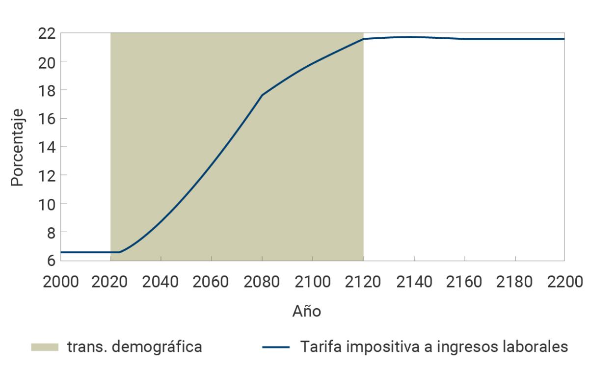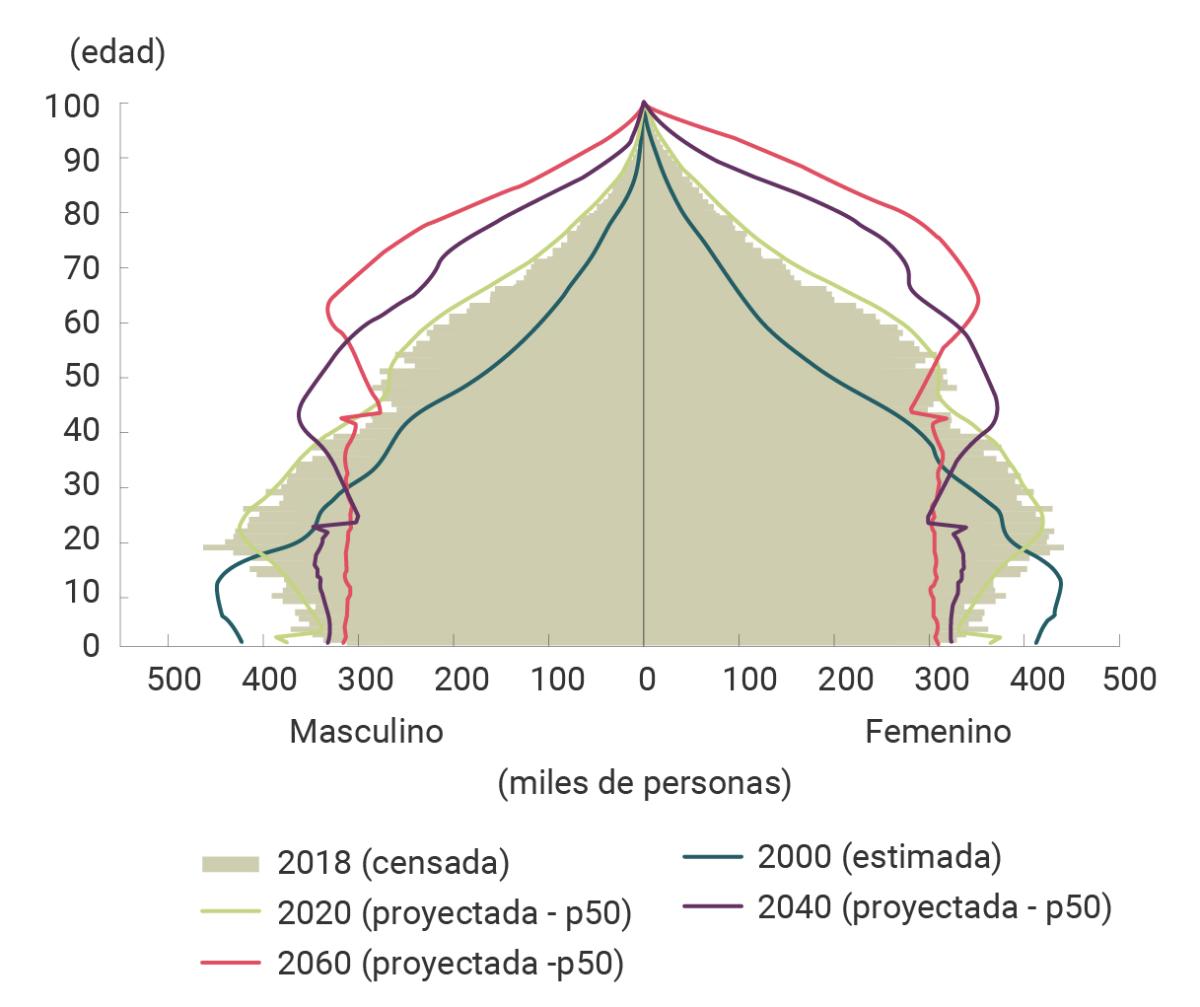 Estas proyecciones demográficas implican que la tasa de dependencia, definida como el cociente entre las personas en edad de trabajar (desde los 18 años hasta la edad legal de retiro) y la población en edad de pensión (mayor a la edad legal de retiro), caería desde el 4,6 en 2018 hasta 1,7 en 2060. En otras palabras, se espera que de casi 5 personas en edad de trabajar por cada persona en edad de pensión que se tiene hoy se pase a casi 2 en 2060. Estas proyecciones marcan un fuerte cambio estructural, toda vez que en la década de los ochenta del siglo pasado la tasa de dependencia era mayor a 8 y, yendo más atrás, en los años cincuenta del mismo siglo, mayor a 9.