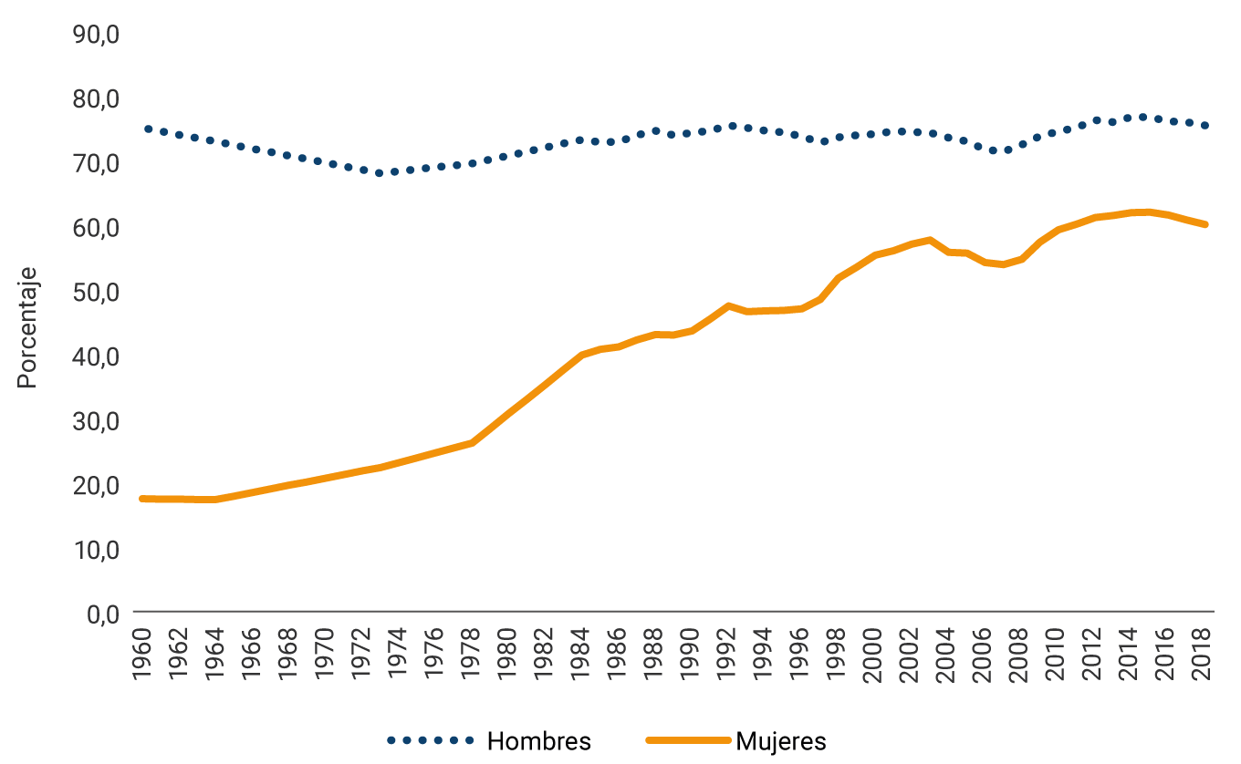 Gráfico 1. Tasas de participación en la fuerza laboral masculina y femenina, 1960-2018 (Promedio siete ciudades)
