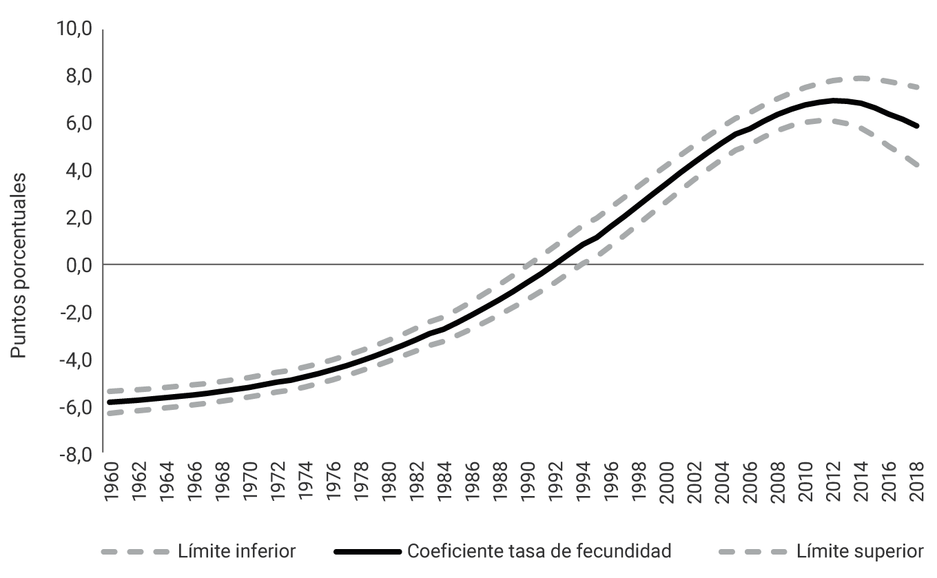 Nota: El área entre el límite inferior y el límite superior indica el intervalo de confianza para el efecto de la tasa de fecundidad.