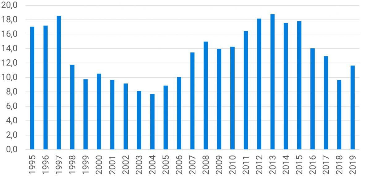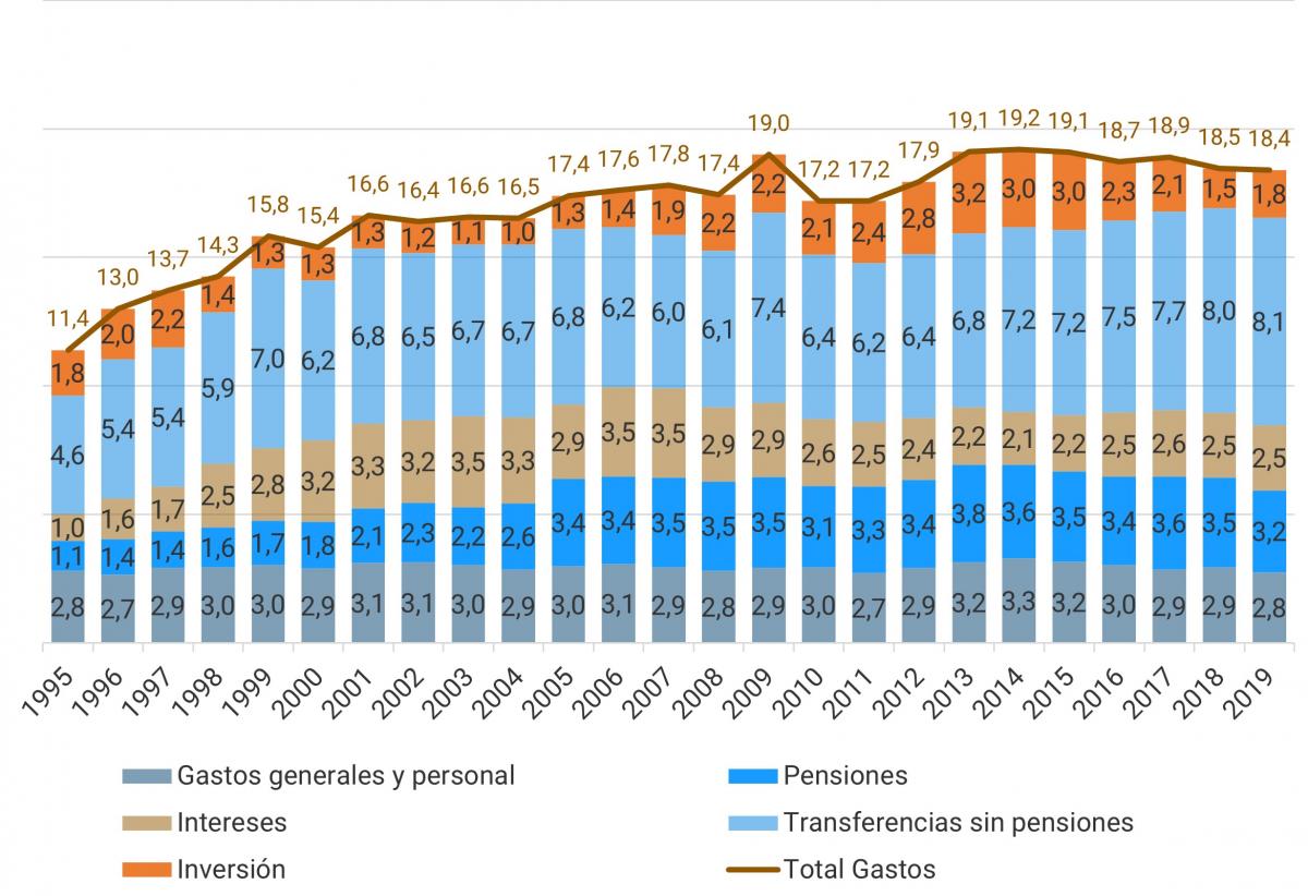 Una primera evidencia de este fenómeno surge al observar en el Gráfico 1 la evolución de los distintos rubros de gasto del GNC durante los últimos veinticinco años. Allí se aprecia un estancamiento relativo de la inversión en FBK, que contrasta con la tendencia creciente de los rubros de transferencias y pensiones. En efecto, la inversión del GNC se mantuvo alrededor de 2,0 % del PIB entre 1995 y 2019, mientras que las transferencias aumentaron de 4,6 % a 8,0 % del PIB y el gasto en pensiones pasó de 1,1 % a 3, 5% del PIB. El estancamiento relativo de la inversión del Gobierno se confirma al observar su participación en el gasto primario (gasto total excluyendo intereses), la cual registra ciclos importantes, pero sin una tendencia clara durante el período analizado (Gráfico 2). El poco dinamismo de la inversión gubernamental se enmarca en el denominado sesgo contra el gasto de capital. Este es un fenómeno característico de muchas economías en desarrollo, que impide que la inversión adquiera mayor importancia dentro del gasto primario.