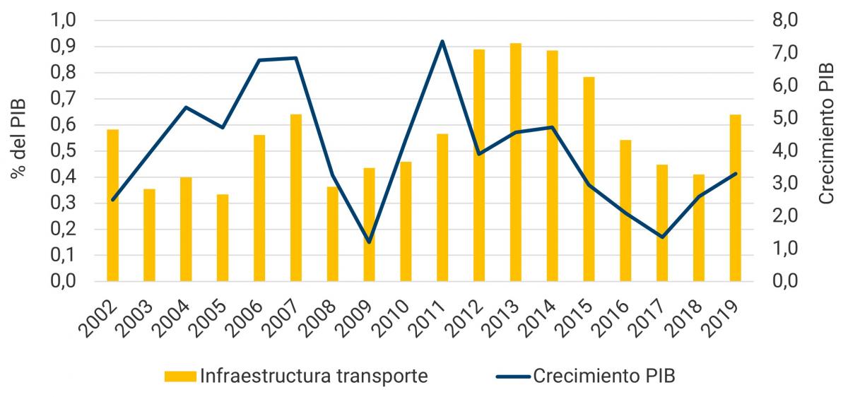 El estudio publicado en mayo pasado por parte del Banco de la República muestra que la inversión en infraestructura de transporte presenta un patrón de estancamiento y de prociclicidad muy similar al de la inversión total del GNC, aunque su nivel es considerablemente inferior al fluctuar alrededor de 0.5 % del PIB.