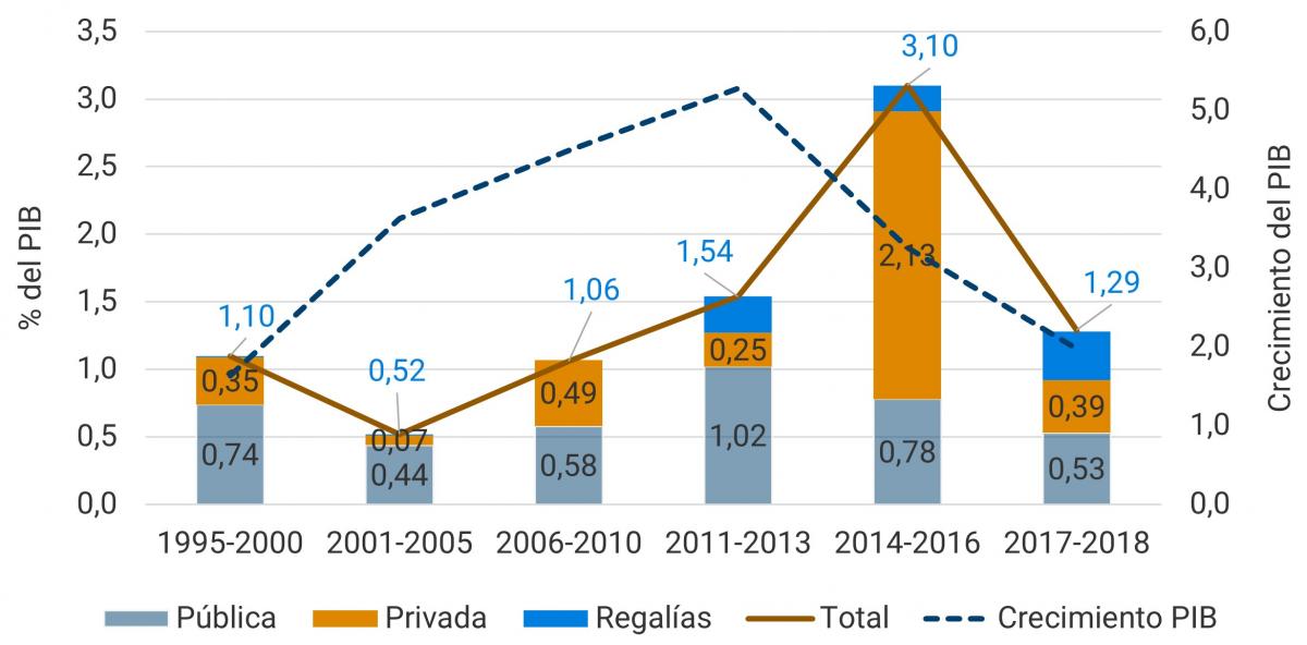 Además de su estancamiento en el largo plazo, el gasto en FBK por parte del GNC exhibe un claro comportamiento procíclico (Gráfico 3). Así, durante los años 1998-2004 en el contexto de una contracción del PIB de 4,2 % en 1999, seguida de una lenta recuperación, la inversión del Gobierno cayó de 2,2 % del PIB en 1997, a un mínimo de 1 % del PIB en 2004. Años más tarde, cuando el crecimiento económico se desaceleró de 5,1 % en 2013 a 1,4 % en 2017 a raíz de la caída del precio de petróleo, la inversión sufrió una reducción significativa al pasar de 3,2 % del PIB en 2013 a 1,5 % del PIB en 2018. En contraste, entre 2005 y 2013 cuando la economía se benefició de favorables términos de intercambio debido a los altos precios del petróleo (interrumpidos temporalmente por la crisis financiera internacional de 2009), la inversión del Gobierno se incrementó progresivamente hasta alcanzar un pico de 3,2 % del PIB en el año 2013.