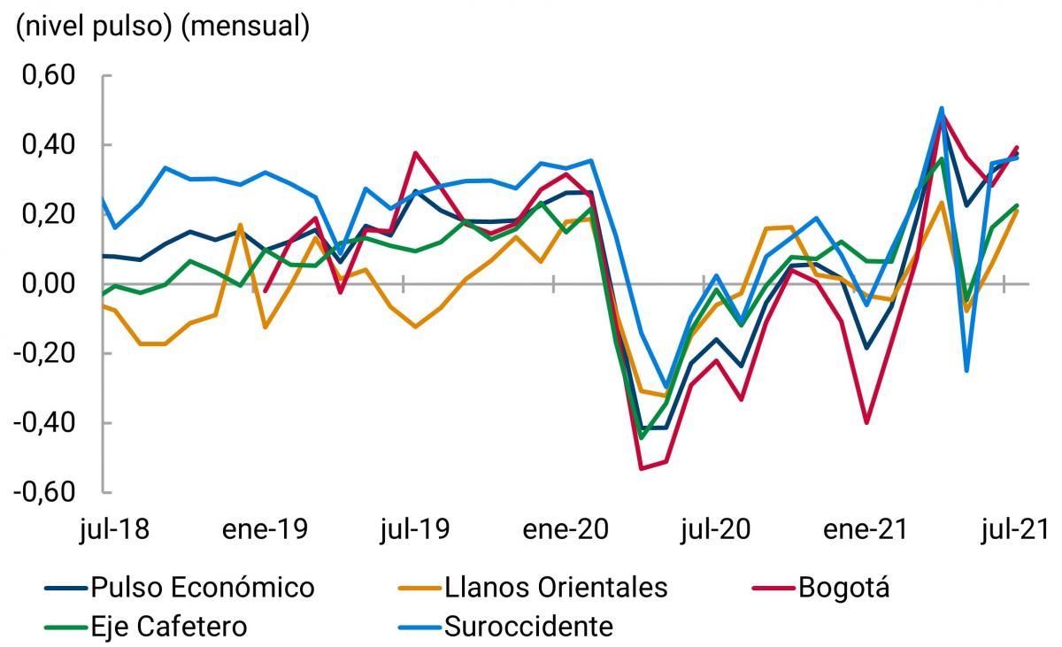 De esta forma, el pulso económico regional complementa de manera muy conveniente los demás indicadores líderes que ofrecen un seguimiento nacional o sectorial de la economía colombiana. Las razones específicas que llevaron a una notoria diversidad de comportamientos entre regiones durante el período de la pandemia ofrecen un interesante reto para los investigadores económicos y sociales del país.