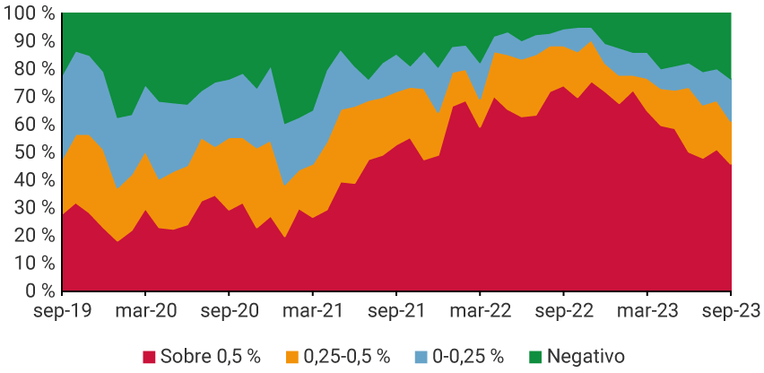 Porcentaje de rubros del IPC sin alimentos ni regulados que superan ciertos niveles de crecimiento mensuales (series desestacionalizadas)
