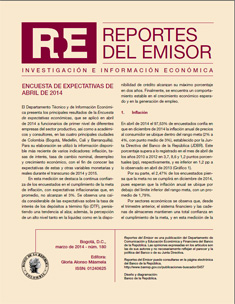El Departamento Técnico y de Información Económica presenta los principales resultados de la Encuesta de expectativas económicas, que se aplicó en abril de 2014 a funcionarios de primer nivel de diferentes empresas del sector productivo, así como a académicos y consultores, en las cuatro principales ciudades de Colombia (Bogotá, Medellín, Cali y Barranquilla). Para su elaboración se utilizó la información disponible más reciente de varios indicadores: inflación, tasas de interés, tasa de cambio nominal, desempleo y crecimiento económico, con el fin de conocer las expectativas de estas y otras variables monetarias y reales durante el transcurso de 2014 y 2015.
