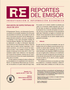 El Departamento Técnico y de Información Económica presenta los principales resultados de la Encuesta de expectativas económicas, que se aplicó en julio de 2014 a funcionarios de primer nivel de diferentes empresas del sector productivo, así como a académicos y consultores, en las cuatro principales ciudades de Colombia (Bogotá, Medellín, Cali y Barranquilla). Para su elaboración, se utilizó la información disponible más reciente de varios indicadores: inflación, tasas de interés, tasa de cambio nominal, desempleo y crecimiento económico, con el fin de conocer las expectativas de estas y otras variables monetarias y reales durante el transcurso de los años 2014 y 2015.